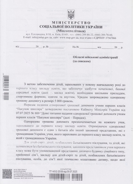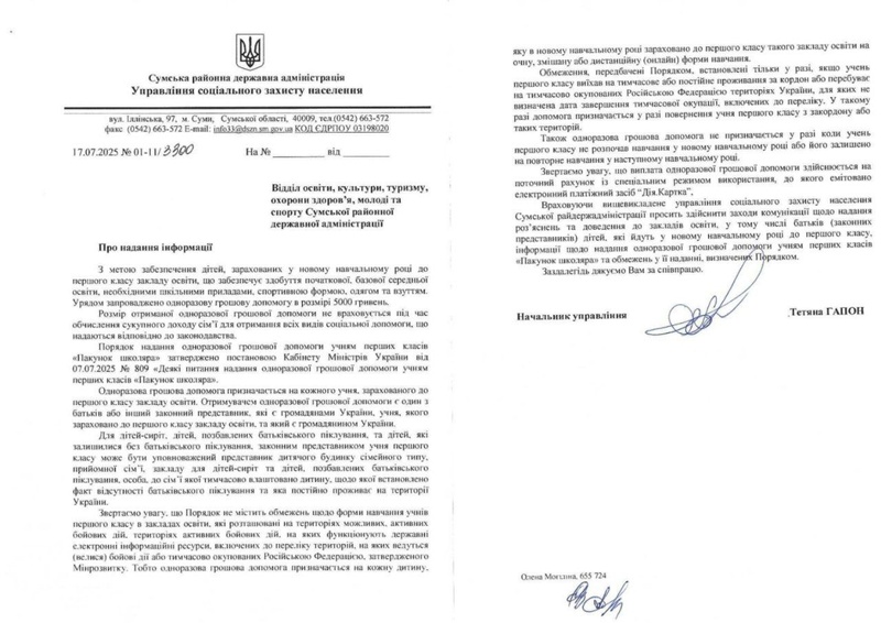 У межах цієї програми батьки дітей, яких у новому навчальному році зараховано до першого класу, зможуть отримати одноразову грошову допомогу – 5 000 гривень.