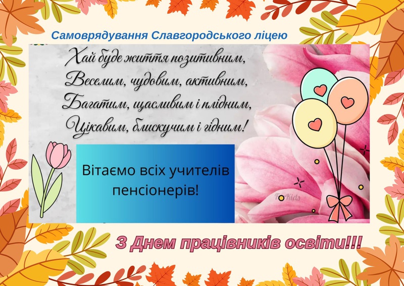 Шановні вчителі-пенсіонери Славгородського ліцею – наш золотий фонд!  Від імені Учнівського самоврядування щиро вітаємо вас із Днем працівників освіти! Ваша праця – це фундамент, на якому збудований наш ліцей. Саме ви, дорогі наші наставники, закладали в душі поколінь учнів найважливіші знання, цінності та любов до рідної школи. Бажаємо вам міцного здоров’я, довгих та активних років життя, сімейного затишку, спокою та тепла. Нехай учнівська любов завжди зігріває ваші серця!