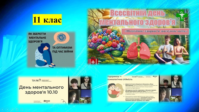 Психічне здоров’я — це основа благополуччя людини, стійкості, здатності відчувати, діяти, підтримувати інших. В умовах війни та спричинених нею постійного емоційного напруження й невизначеності кожен із нас стикається з надмірним навантаженням на психічне здоровʼя, відчуває стрес і втому. Саме тому важливо не ігнорувати власні почуття, а навчитися піклуватися про своє психічне здоров’я. Турбуючись про себе, ми створюємо більш стійку й турботливу спільноту. Тому говорімо про свої почуття, підтримуймо одне одного, не залишаймося сам на сам із переживаннями. Піклуйтеся про близьких вам людей, підтримуйте один одного: словами, діями, розумінням, увагою, обіймами, чи теплим дотиком. Саме цього дня у нашому закладі проведено різноманітні заходи з учасниками освітнього процесу: бесіди, вікторини, ігри, години спілкування, тренінги, лекції.