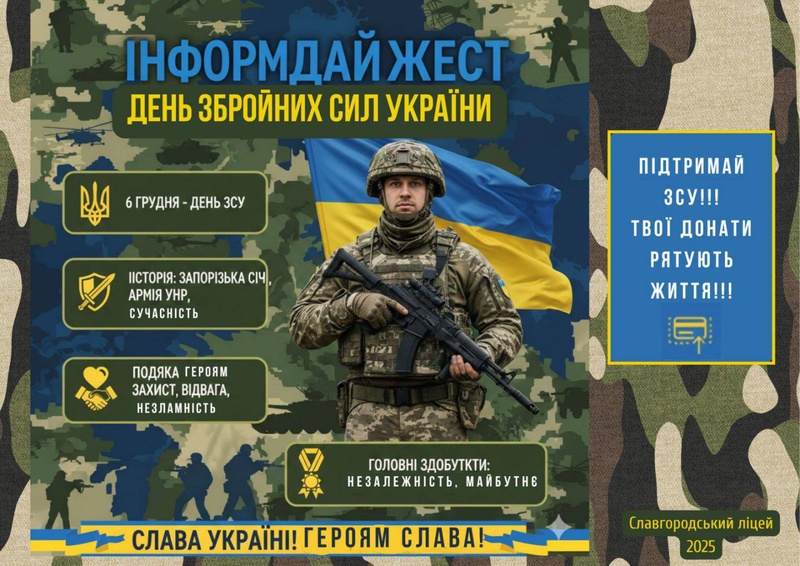 Щороку 6 грудня Україна відзначає День Збройних Сил України — свято мужності, героїзму та незламності тих, хто стоїть на захисті нашої держави. Тому, напередодні, у Славгородському ліцеї було проведено ряд патріотичних заходів, спрямованих на підтримку наших захисників і виховання в учнів любові до рідної землі. Були проведені виховні заходи, уроки патріотизму та години спілкування, де учні дізнавалися про історію Збройних Сил України, героїзм сучасних захисників та роль кожного з нас у підтримці воїнів. Ці заходи є свідченням того, що навіть найменші вчинки мають велике значення для нашої перемоги. Дякуємо ЗСУ за відважну боротьбу з ворогом! Хай вам буде тепло від людської вдячності та надійно від підтримки рідних. Дякуємо за мужність!