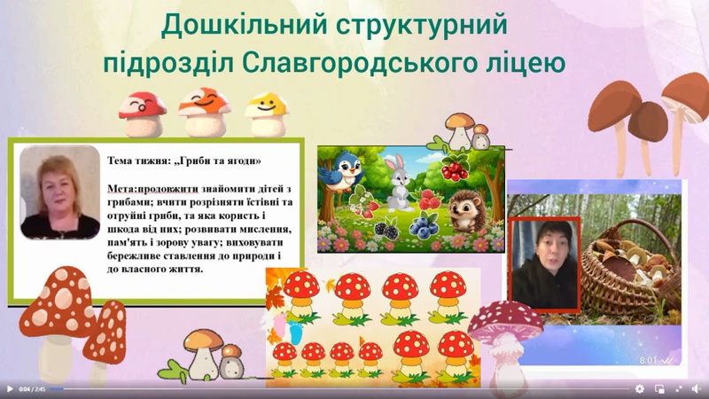 10.10. - Цього тижня ми вивчали тему: "Гриби та ягоди – дари осені". Мета тижня: Закріпити знання дітей про гриби та ягоди, їх значення для людини і природи; розрізняти їстівні та отруйні гриби. Розвивати пізнавальну активність, мовлення, логічне мислення, увагу та дрібну моторику. Формувати уявлення про геометричну фігуру овал та кількісні відношення «більше – менше». Ознайомити з новою літерою Н та її звуком, формою, написанням. Виховувати обережність у природі, любов до осіннього лісу, бажання спостерігати та дбати про довкілля. Розвивати музичні здібності, почуття ритму, емоційне сприйняття пісень про осінь, гриби та ягоди. Наші вихованці великі молодці, адже старанно працювали, слухали, співали, малювали, грали в ігри й допомагали один одному!