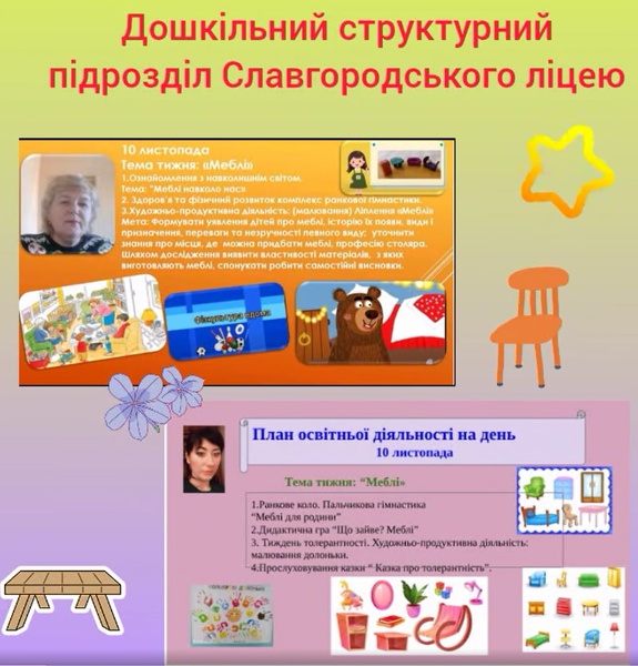 14.11. - Цей тиждень був дуже цікавим! Для діток проводилася пізнавально-розвивальна робота за темою «Меблі». Малята знайомилися з різними видами меблів, їх призначенням та особливостями. У мовленнєвій діяльності ми вивчали нову букву «Б», добирали слова на цю букву та закріплювали знання через ігрові вправи. Вихованці із задоволенням брали участь у творчих видах діяльності: ліпили меблі з пластиліну, малювали їх, створювали аплікації, вчилися передавати форму та деталі предметів. Протягом тижня проводилися цікаві дидактичні ігри та виконувалися різноманітні розвивальні завдання. Читання казочок про меблі допомогло дітям розвинути пам’ять та уяву. Тиждень був насиченим, пізнавальним і сприяв розвитку мовлення, творчості та логічного мислення малят.