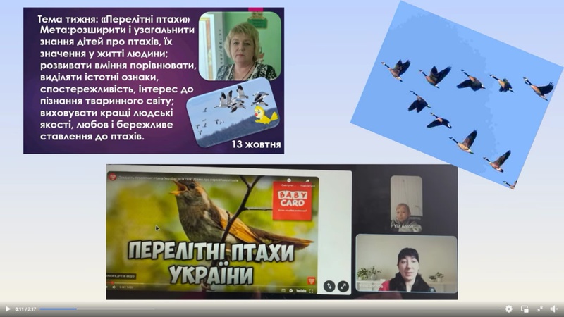 17.10. - Цього тижня ми працювали над темою: «Перелітні птахи». Мета наших занять: закріпити та розширити знання дітей про перелітних птахів, їх спосіб життя, особливості поведінки восени; формувати уявлення про зміни в природі, що спонукають птахів відлітати у теплі краї; виховувати любов і дбайливе ставлення до птахів, бажання допомагати їм.