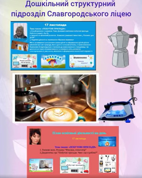 21.11. - Протягом тижня з 17 по 21 листопада у дошкільному структурному підрозділі з дітками проводилася пізнавально-розвивальна робота за темою «Побутова техніка». Малята ознайомилися з різними видами приладів, їх призначенням та правилами безпечного користування. У ході занять ми також вивчали літеру «Т», добирали слова з цією буквою, робили звуковий аналіз слів, виконували різноманітні тематичні завдання. З математики діти закріплювали знання про цифру 5, рахували предмети, виконували ігрові вправи на кількісне порівняння. Тиждень був дуже насичений, цікавий та корисний для розвитку дітей.