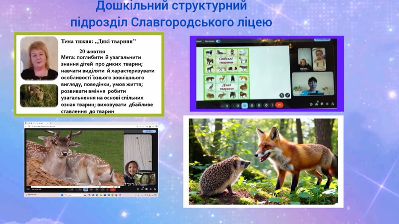 24.10. - Цього тижня разом із дітками ми розпочали нову тему — «Дикі та свійські тварини». На нас чекали захопливі ігри, пізнавальні бесіди, творчі завдання, зустрічі з казковими героями та багато нових відкриттів про тварин. Метою наших занять було: розширити знання дітей про диких та свійських тварин, їх зовнішній вигляд, місце проживання та звички. Формувати уявлення про необхідність охорони тварин і природи. Розвивати мовлення, мислення, увагу, дрібну моторику пальчиків. Виховувати любов до природи, доброту та дбайливість. Протягом тижня психолог проводила різноманітні форми роботи такі як: психологічні ігри та вправи на розвиток уваги, пам’яті, мислення та емоційного самоконтролю (гра «Настрій тварин», «Дзеркало емоцій», «Добрий ліс»). Дякуємо батькам та діткам за активну участь протягом тижня. Разом ми дізналися багато нового про життя лісових та домашніх мешканців, грали, творили, розвивали спостережливість і любов до природи. Дякуємо за підтримку, цікаві ідеї та гарний настрій протягом тижня!