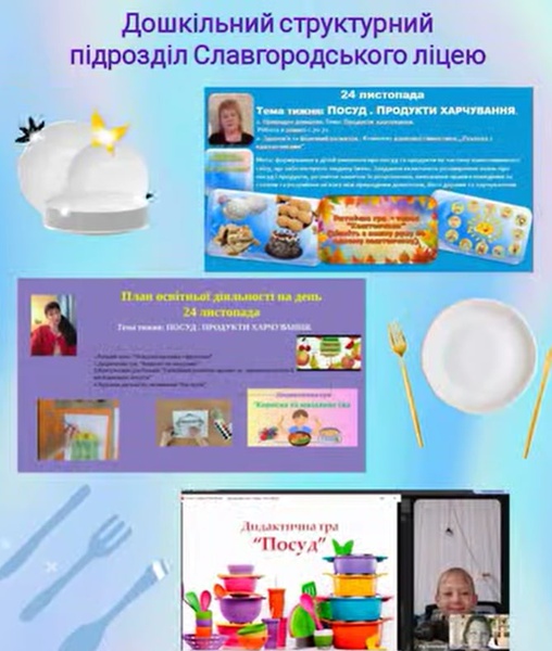 28.11 - Навчальний тиждень «Посуд. Продукти харчування» (24.11.25-28.11.25) пройшов у нашому дошкільному структурному підрозділі дуже цікаво та змістовно! Метою проведених занять було розширення знань дітей про посуд та корисні продукти харчування, їх призначення. Малята вчились називати предмети і можливі дії з ними. Збагачували словниковий запас слів вихованців. Розвивали пам’ять, увагу. Корегували мовлення дітей, осанку. Проведені заняття сприяли вихованню правил поведінки за столом та розуміння зв'язку між природним довкіллям, його дарами та харчуванням, почуття поваги один до одного.