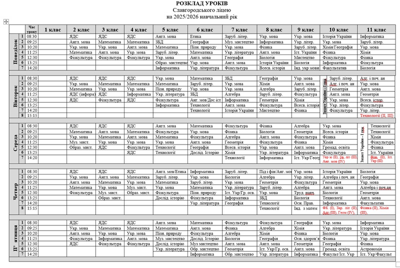 РОЗКЛАД УРОКІВ НА 2025/2026 н. р.