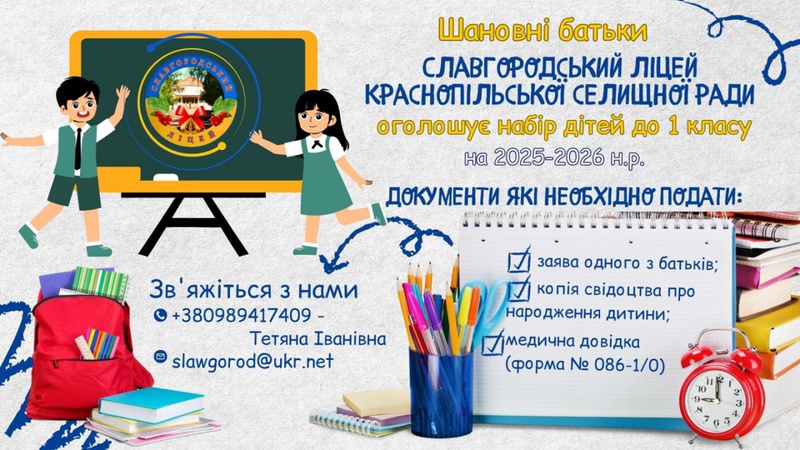 Славгородський ліцей Краснопільської селищної ради продовжує прийом заяв для зарахування дітей до 1 класу, що здійснюється на підставі заяви одного з батьків, наданої власноруч, медичної довідки та копії свідоцтва про народження дитини.